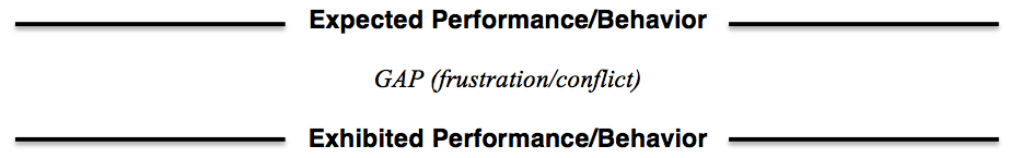 Ultimately, you want to firmly establish and clearly communicate your expectations and Standards to your team at the beginning of the season to avoid the frustration of unmet expectations during the season (or after the season). Much of the conflict that distracts, divides, and destroys a team comes down to unmet expectations and Standards. People typically become frustrated when athletes do not do or meet what is expected of them. The frustration is the result of the gap between the Expected Performance or Behavior and the Exhibited Performance/Behavior as shown below: